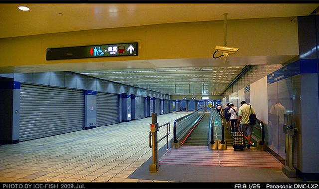 圖18的商店街及電動步道 據我了解, 圖19所拍的門以外至1,2號出入口之間的地下聯通道, 好像是北捷做給松山機場的, 因此商店街的招標及維護可能是屬於松山機場管轄, 而不是北捷的範圍。